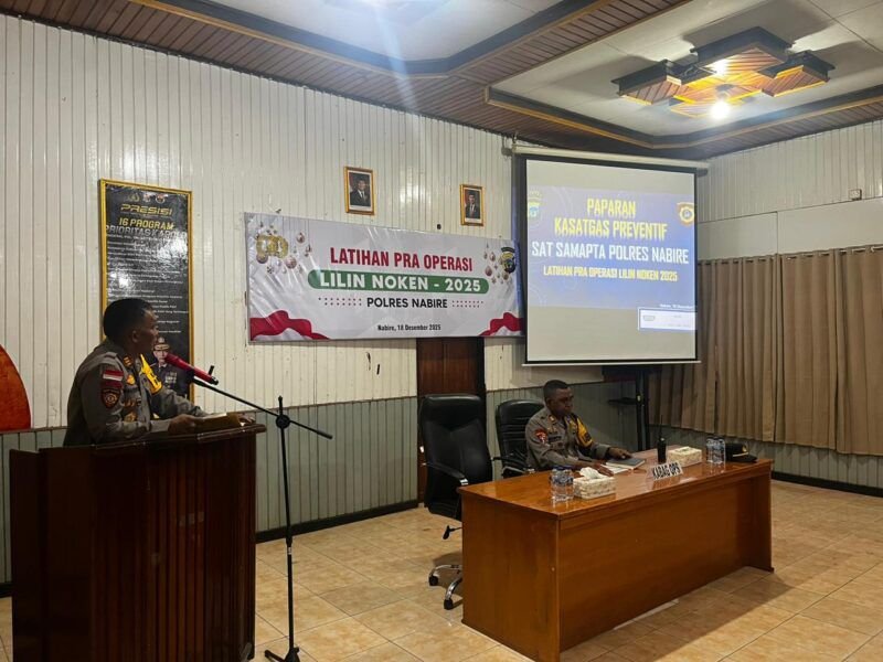 Nabire jelas.com|| NABIRE – Menjelang perayaan Natal 2025 dan Tahun Baru 2026, Polres Nabire bergerak cepat memastikan keamanan wilayah tetap kondusif. Pada Kamis pagi (18/12/2024), jajaran Polres Nabire melaksanakan Latihan Pra Operasi (Lat Pra Ops) Lilin Noken 2025 bertempat di Ruang RBP Polres Nabire.